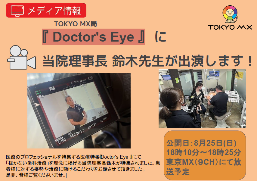 医療のプロフェッショナルを特集する医療特番『Doctor’s Eye 』にて「抜かない歯科治療」を理念に掲げる当院理事長鈴木が特集されます。患者様に対する姿勢や治療に懸けるこだわりをお話させて頂きました。